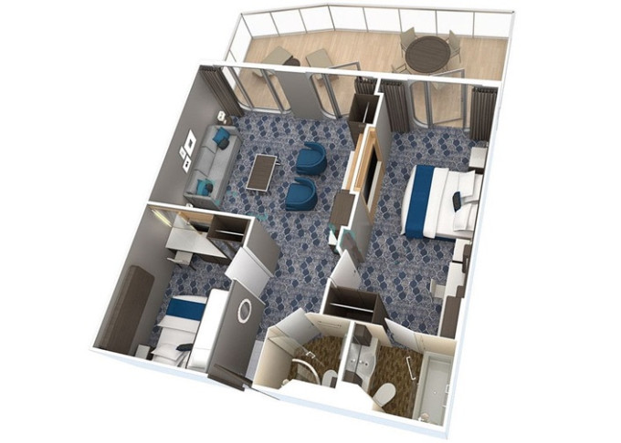 1A - Veľká kajuta s veľkým balkónom Ultra Spacious 25 m² + balkón 7,5 m². Oddelená časť s poschodovou posteľou. Max 6 osôb. 3 199 € 3 199 € za osobu