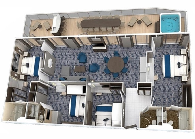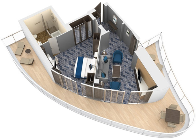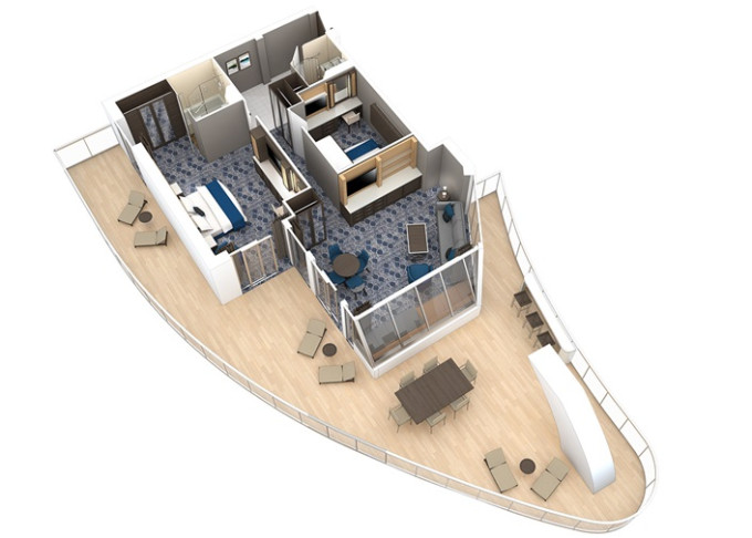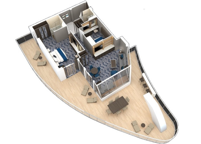 OS - Owner’s Suite s balkónom 51,5 m² + balkón 22 m². Max 4 osoby. Výhody Royal Suite Sky Class. 5 461 € 5 461 € za osobu